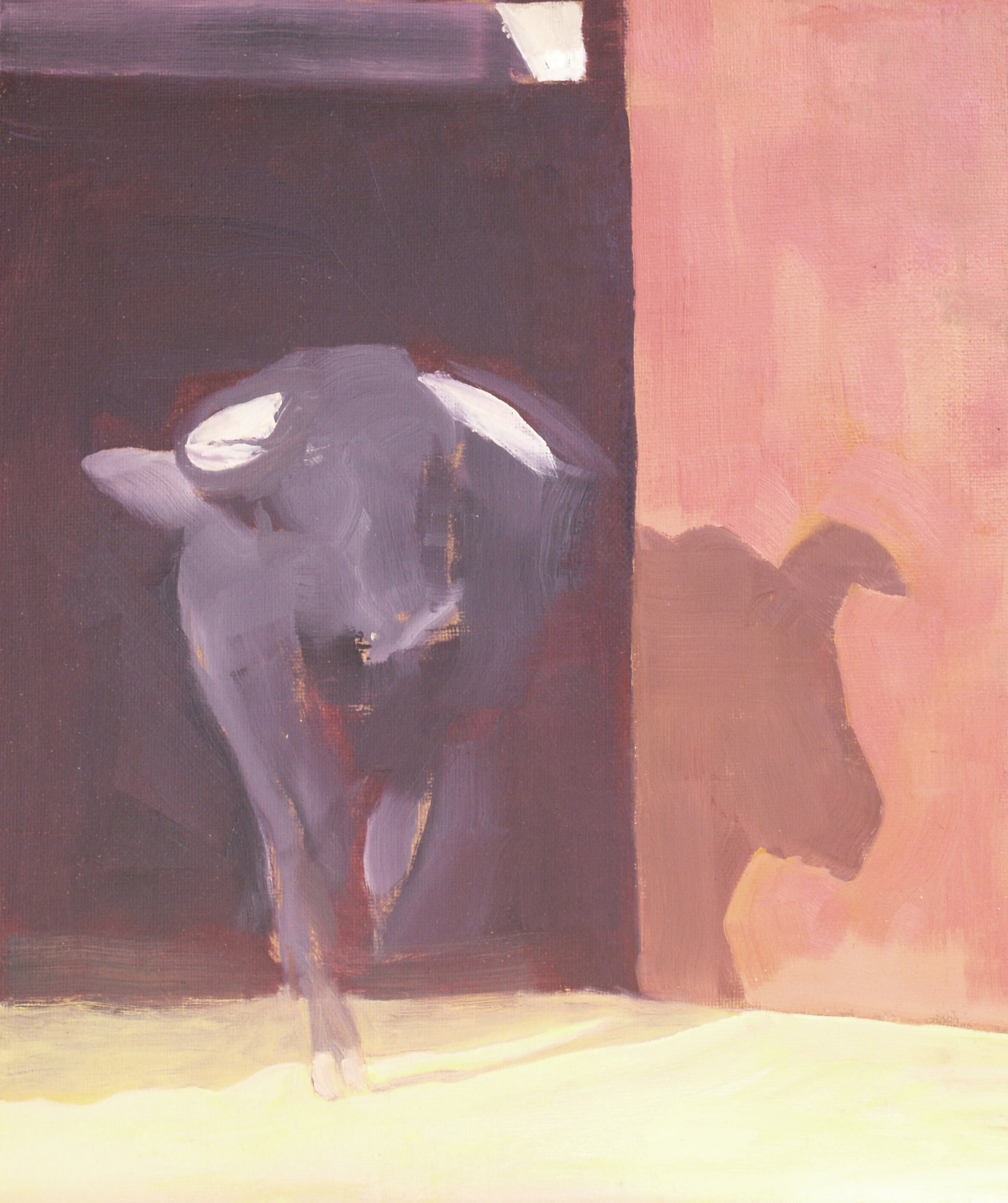 The bull enters the ring - a sustained moment of uncertainty. The richly coloured ordinariness of the scene and the minimal composition, hold that tension as the powerful force of the unknown arrives.
