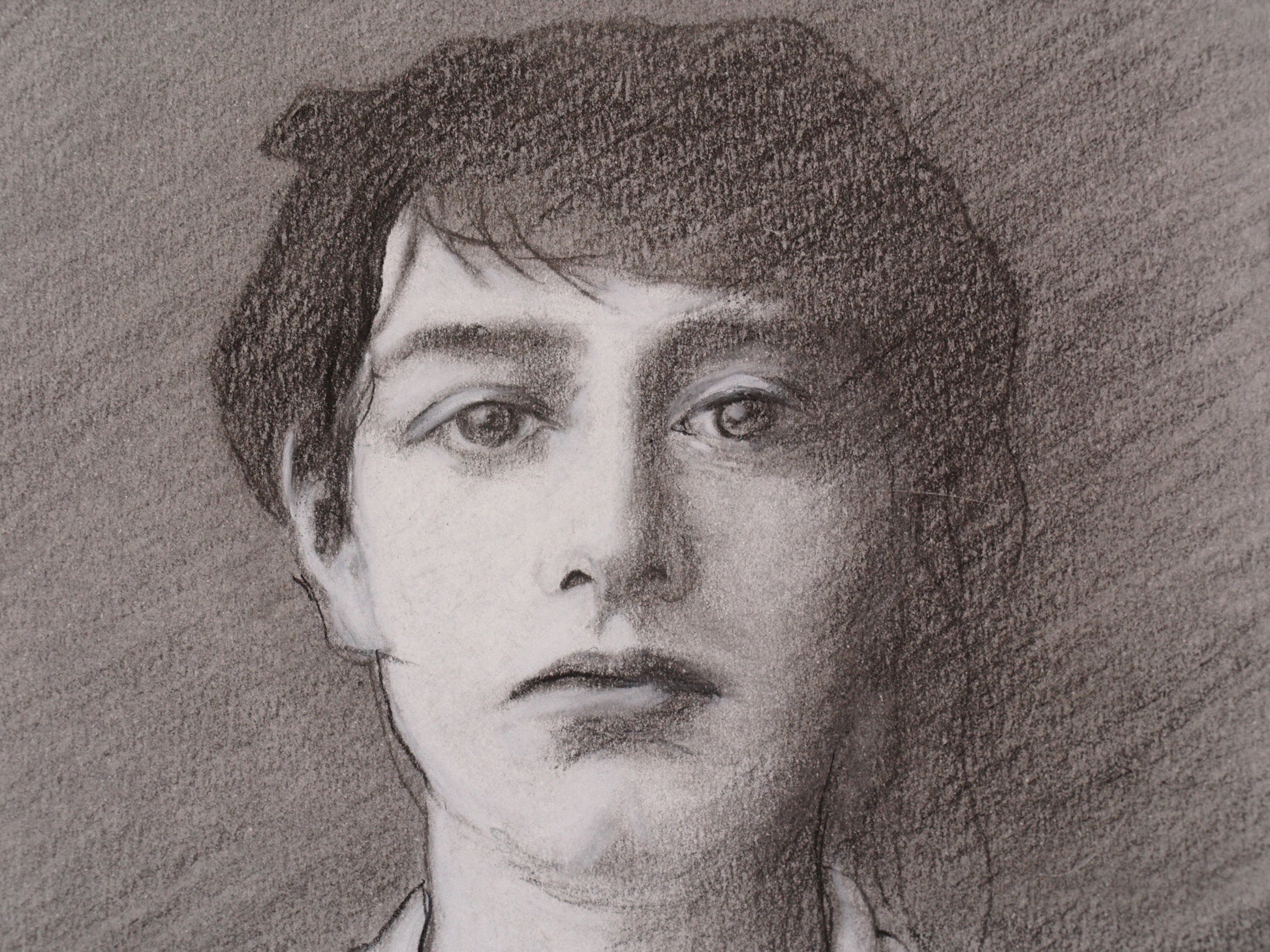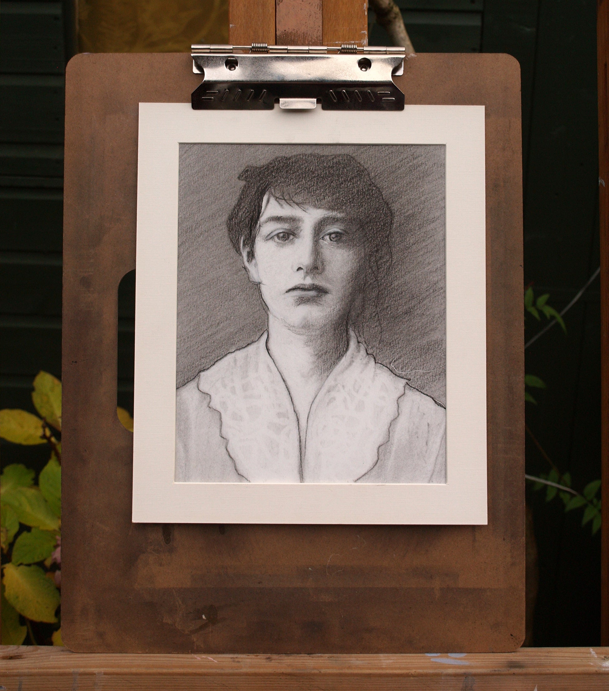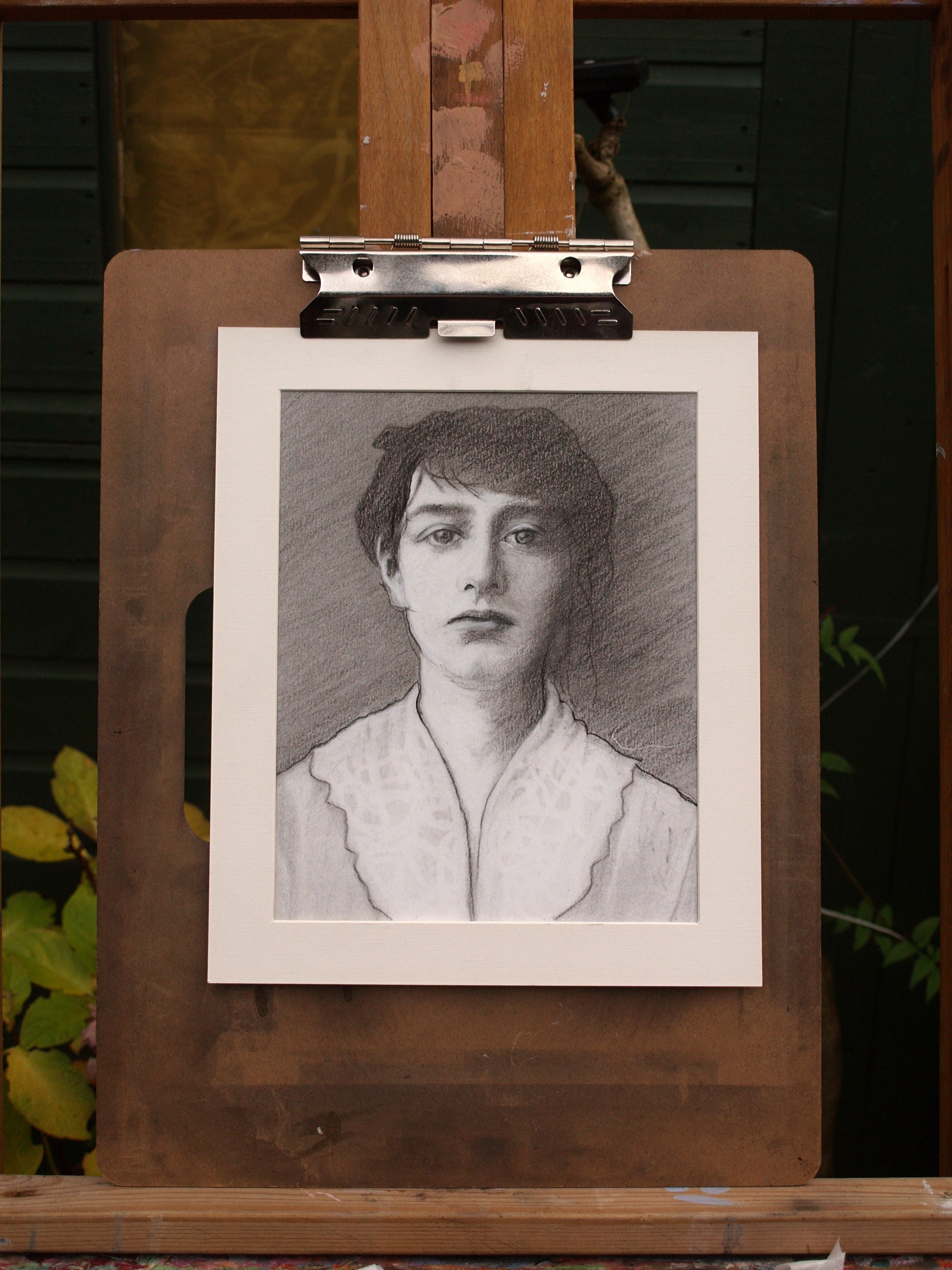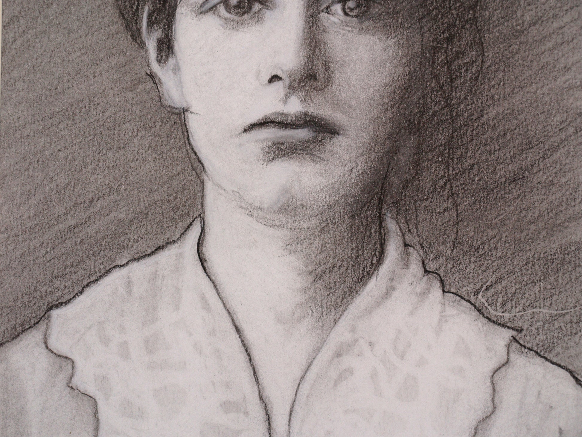 Camille Claudel before an early camera. There's an absence of performance—she's simply present, neither offering nor withholding anything. This sense of someone who hasn't arranged themselves into an image. The charcoal tries to preserve that unguarded moment.