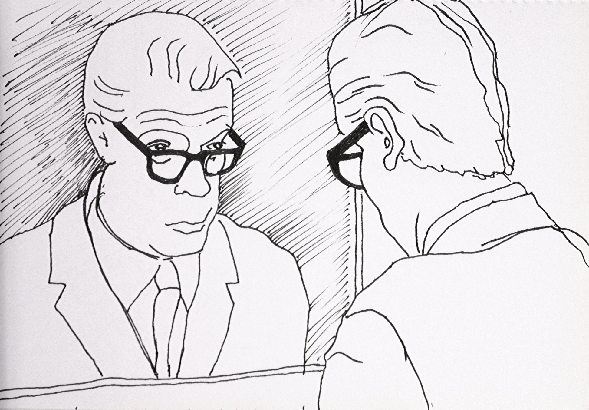 This line drawing captures a memorable scene from Fellini's iconic film '8½', humorously portraying the main character examining his conscience.