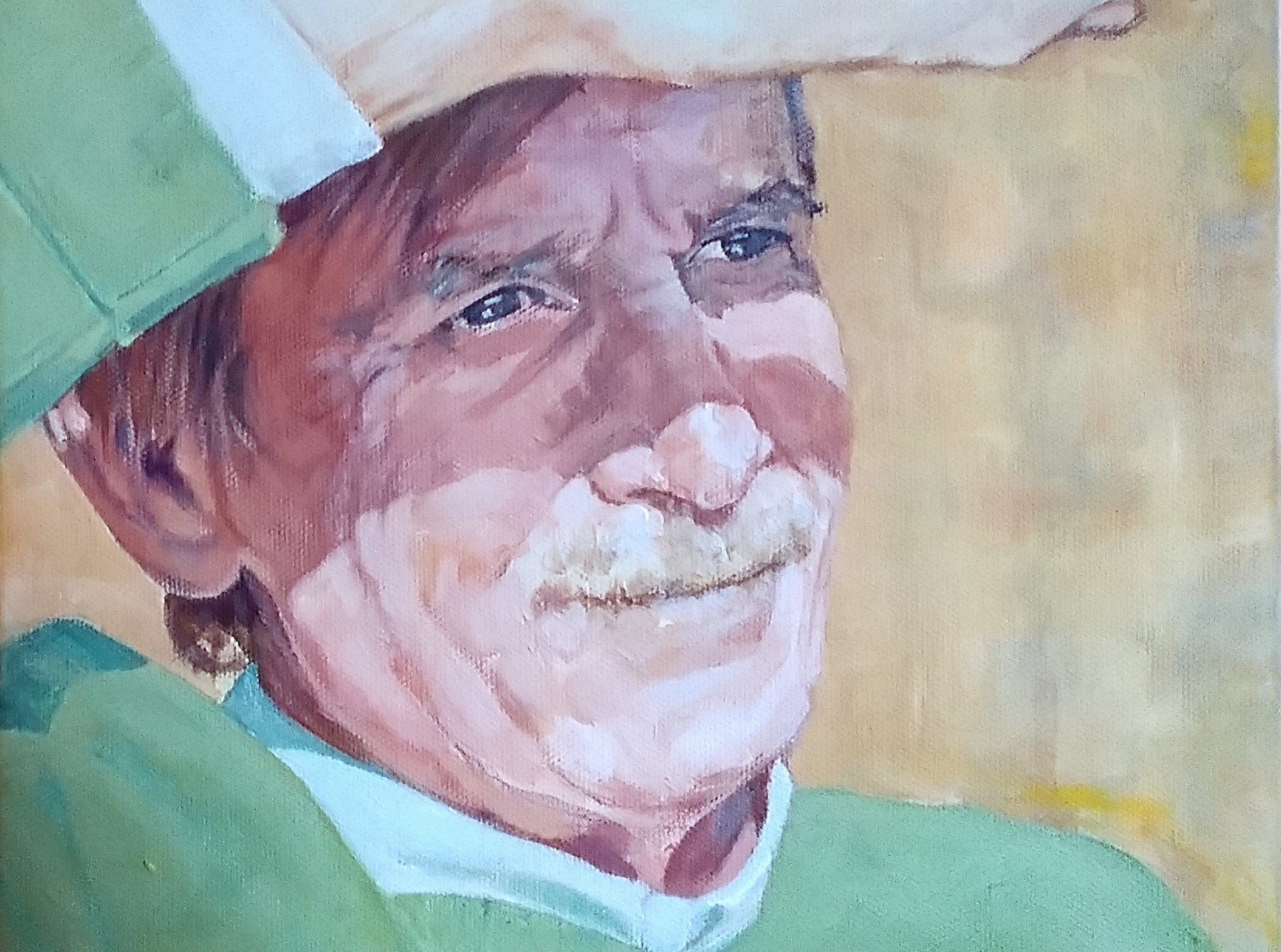 Portrait of Paul H., painted from a photograph taken a couple of years earlier. The composition captures a moment of seeing - hand raised to shade the eyes from intense sunlight.
