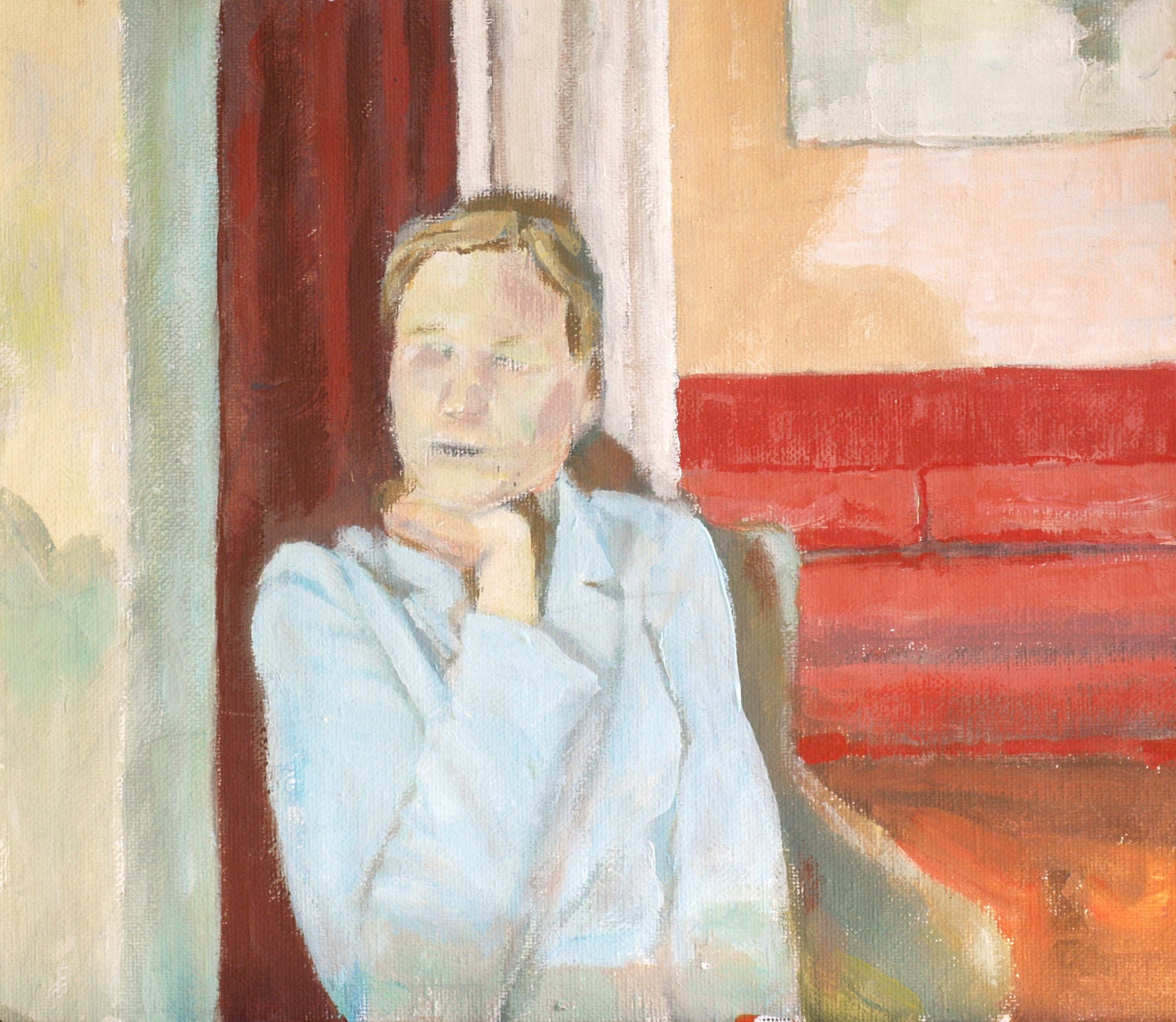 Where the Spanish balcony meets the computer screen. A woman observes. Her pose is unselfconscious as we watch. The paint gently depicting a quality of modern attention, between two worlds.